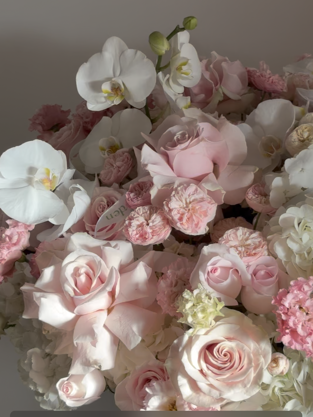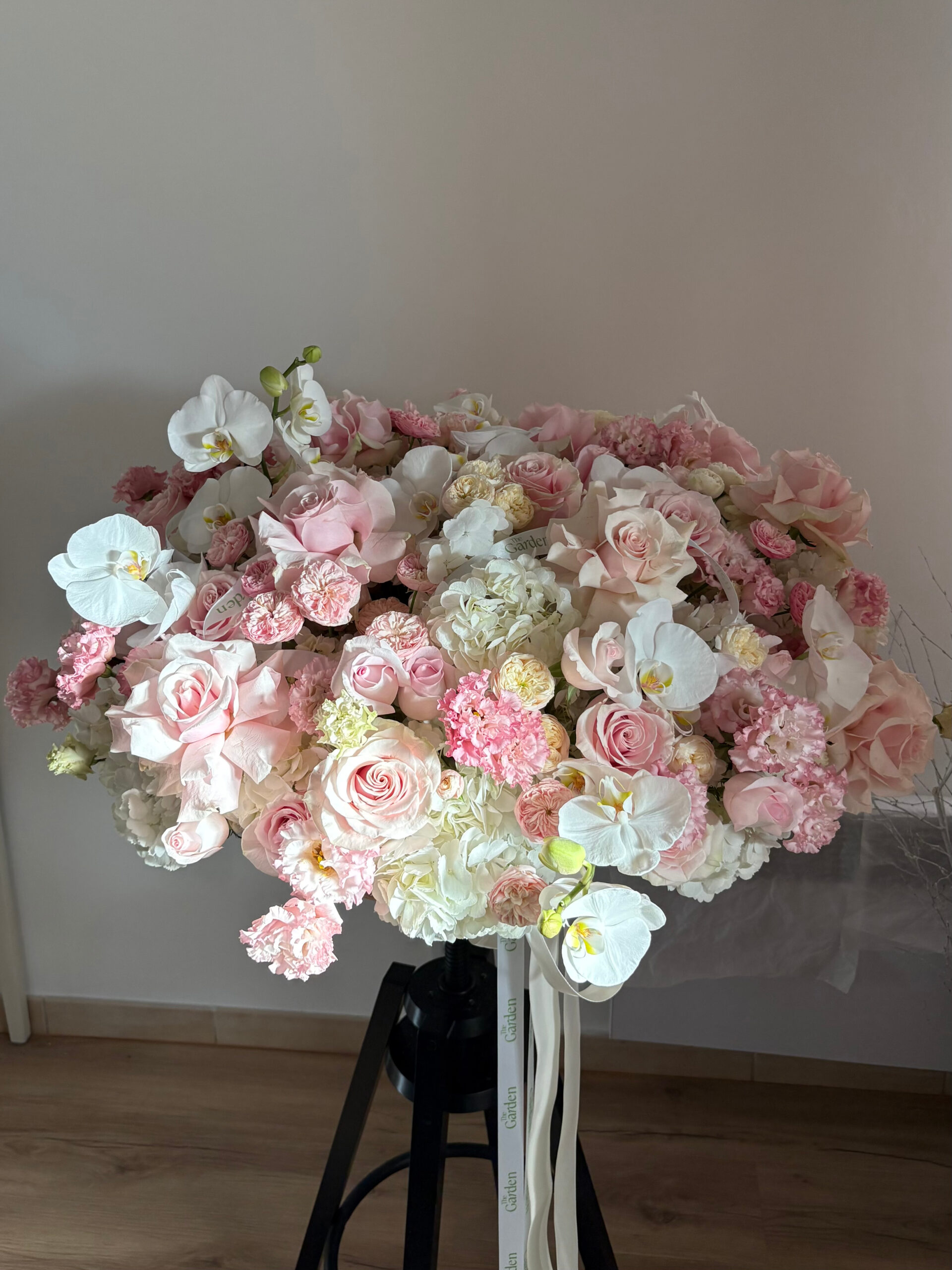 Blush Éternelle is a grand couture floral composition designed in a luminous palette of blush, ivory, and soft pink tones. This statement arrangement blends voluminous hydrangeas, premium roses, peony-style garden roses in multiple varieties, delicate lisianthus, and elegant orchids.