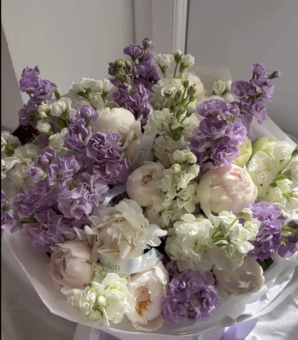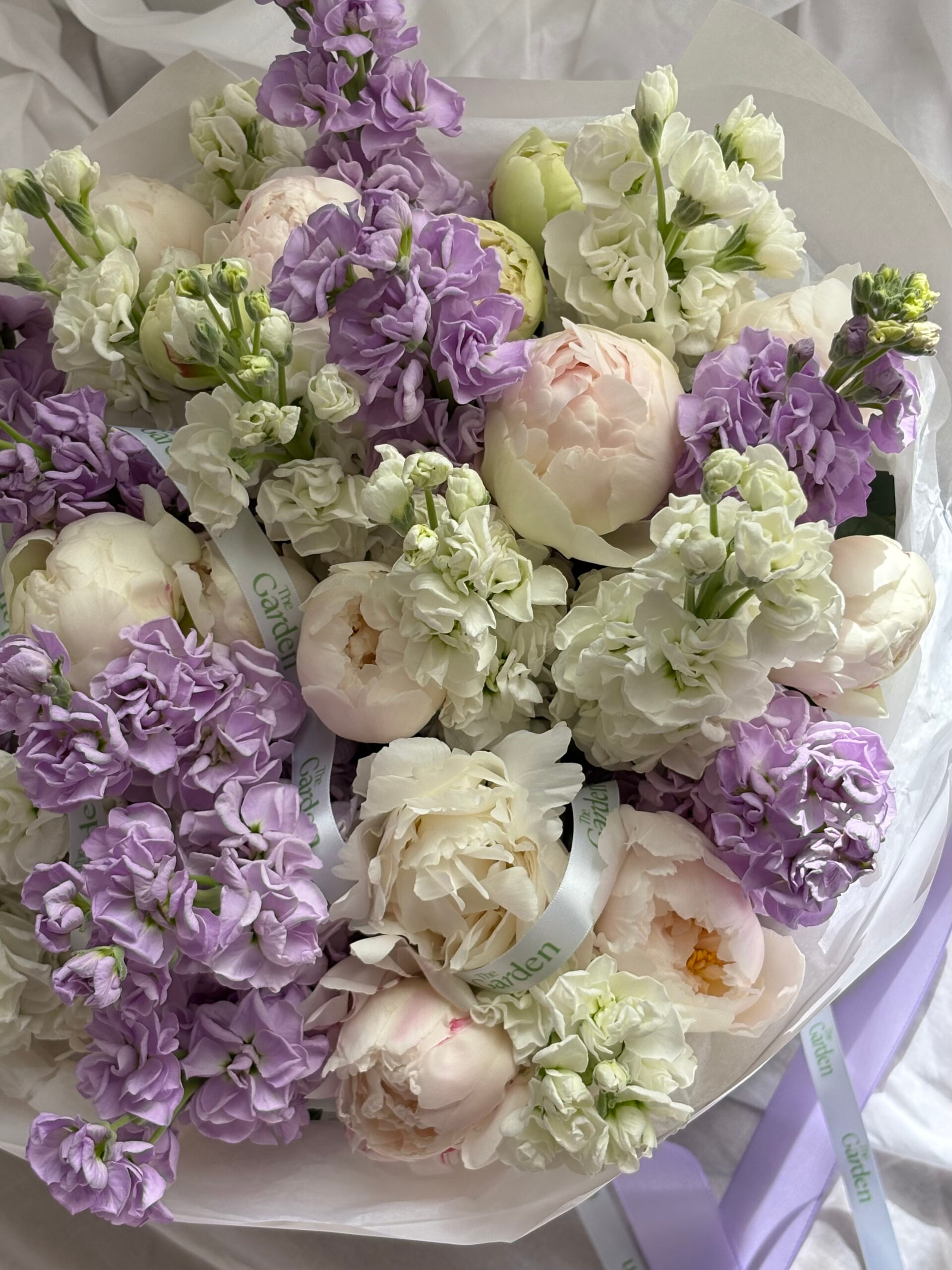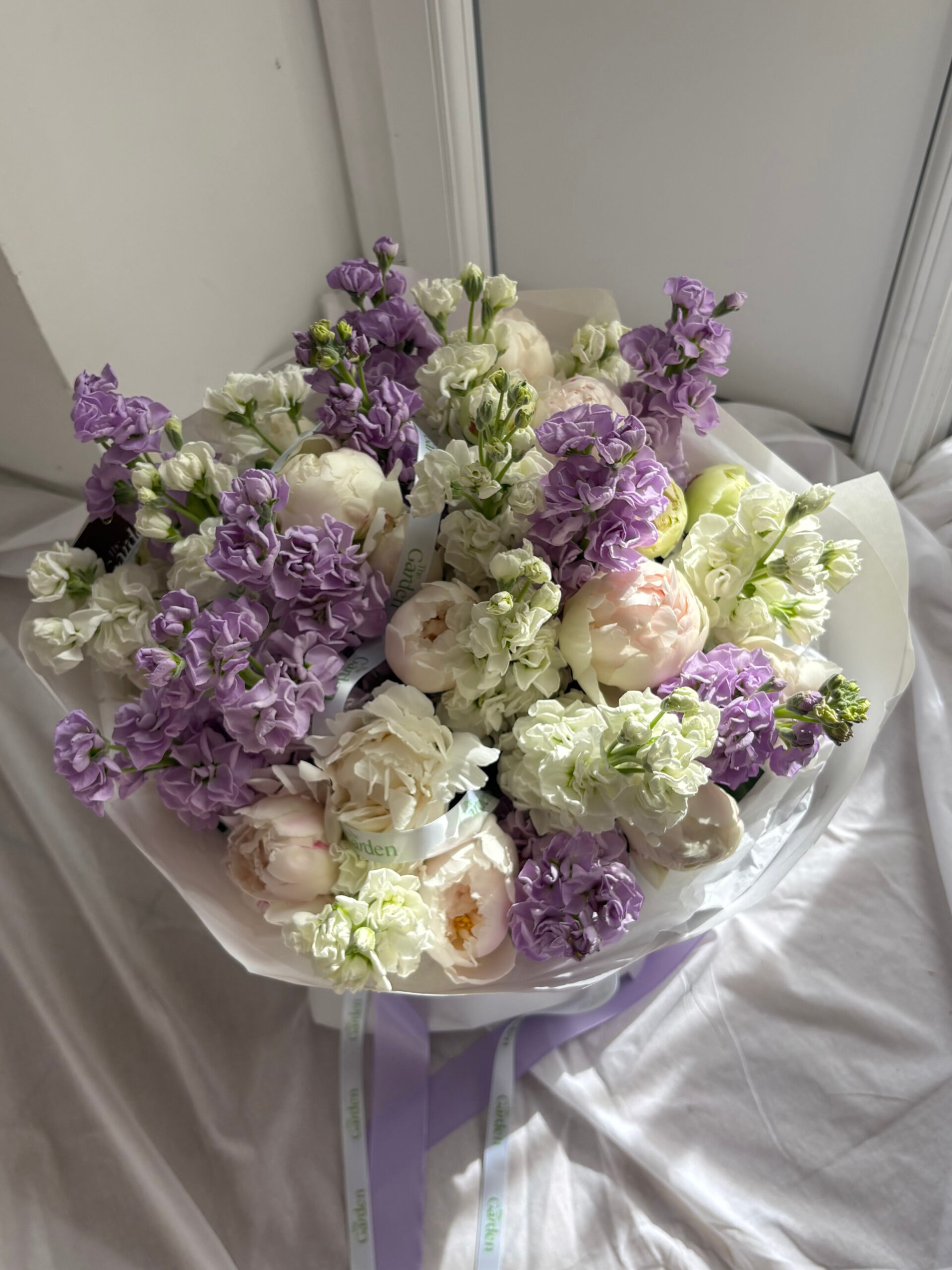 Voluminous peonies create sculptural fullness and romantic depth, while matthiola adds vertical movement, texture, and a subtle, graceful fragrance. The contrast between creamy neutrals and airy lavender shades gives the bouquet dimension while maintaining a soft, harmonious silhouette.