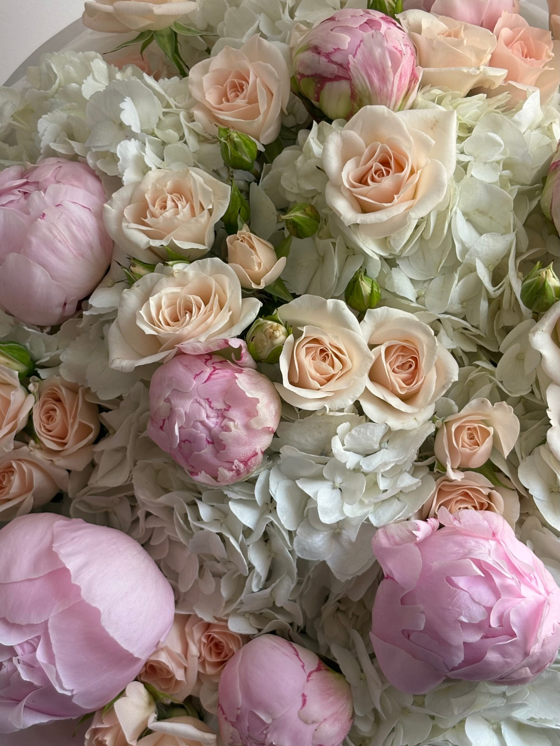 Peonies bring generous, layered fullness and a sculptural silhouette. Hydrangeas create a cloud-like base, adding depth and harmonious volume, while spray roses introduce fine texture and refined detailing. The combination results in a balanced, couture-style bouquet with graceful movement and dimension.