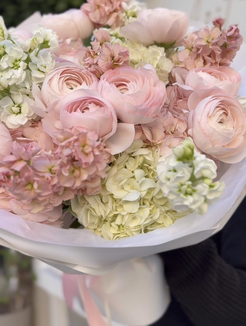 The Desi bouquet is a refined floral composition blending lush hydrangeas, delicate ranunculus, and fragrant matthiola for a soft, airy, and elegant look.