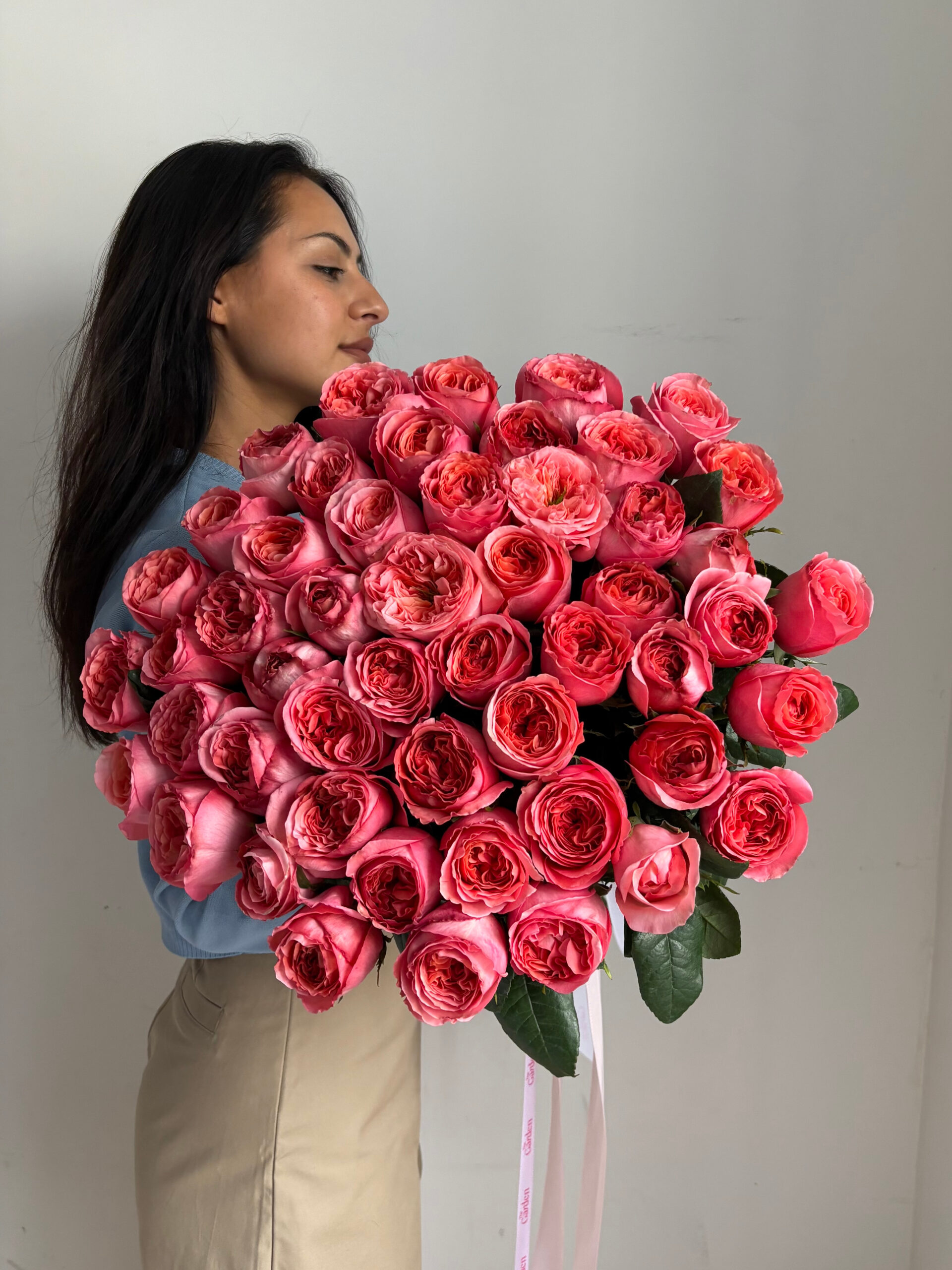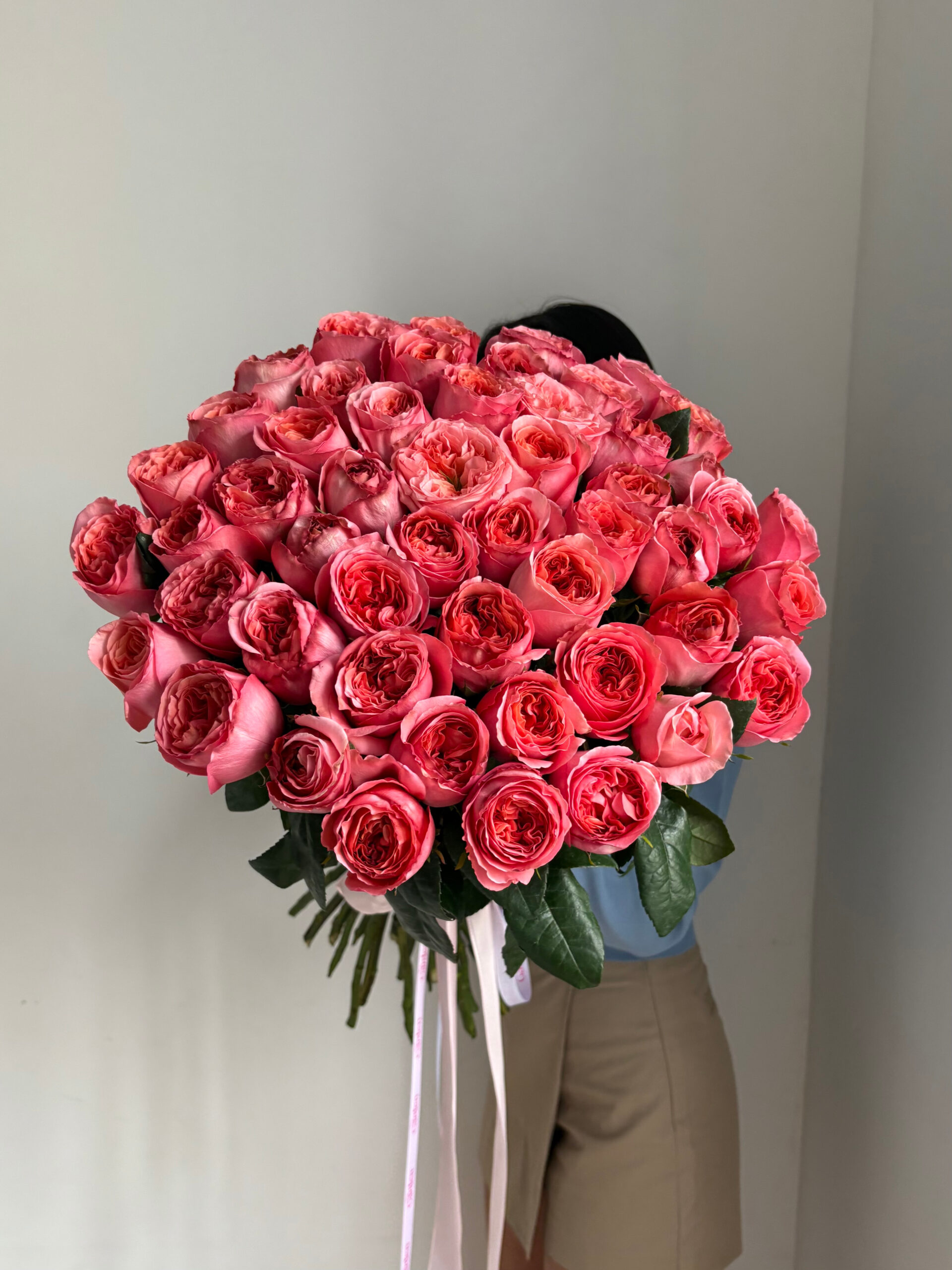 Pink Expression is a bold mono bouquet composed of premium garden-style roses in an intense coral-pink shade. With their richly layered petals and perfectly sculpted rosettes, these blooms create a striking and expressive floral statement.